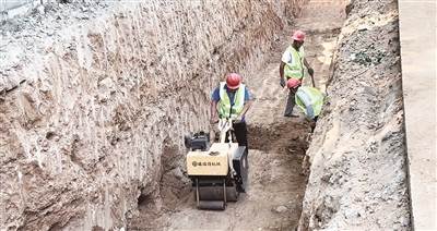 6月20日,记者在迎胜路(迎胜东路—东岳大街)管网改造工程项目现场看到,施工人员将迎胜路东侧车行道地面深挖并进行基本处理后,沿沟槽敷设雨水管线。